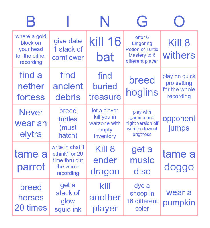 This bingo card has 45 words: Never wear armor, let a player kill you in warzone with empty inventory, kill 8 brute in a bastion, breed horses 20 times, get on a pig and make 'oink' sound 20 times, dye a sheep in 16 different color, kill 16 bat, brew 5 different lingering potion, Kill 8 withers, get a stack of glow squid ink, offer 6 Lingering Potion of Turtle Mastery to 6 different player, play with gamma and night version off with the lowest brigtness, Kill 8 ender dragon, write in chat 'I sthink' for 20 time thru out the whole recording, Tp to 3 player and give them 2 stack of gold each, kill another player, craft a netherite block, Never wear an elytra, mine 2 stack of obsidian, play on quick pro setting for the whole recording, give date 1 stack of cornflower, Kill 18 warden, give date1 stack of blue orchid, where a gold block on your head for the either recording, get 100 xp point, opponent jumps, cure a zombie villager, eat a pufferfish, get a music disc, tame a parrot, tame a cat, tame a doggo, breed pandas, obtain a froglight, breed frogs (must hatch), breed turtles (must hatch), get every wood type, wax copper, wear a pumpkin, find buried treasure, find a nether fortess, breed hoglins, barter with piglins, find ancient debris and smelt a gold swords.