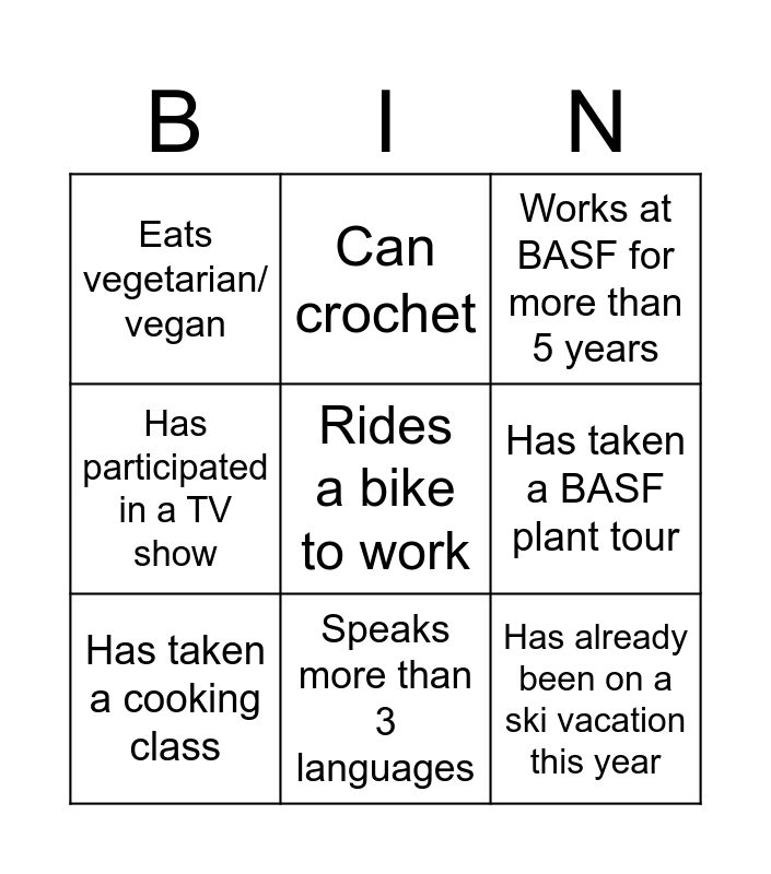 This bingo card has 15 words: Has an electric car, Speaks more than 3 languages, Works at BASF for more than 5 years, Eats vegetarian/ vegan, Rides a bike to work, Has already been on a ski vacation this year, Has a solar system at home, Has participated in the BASF company cup, Has more than 2 children, Has taken a cooking class, Has seen one of the world wonders, Has taken a BASF plant tour, Has participated in a TV show, Can crochet and Has been to Shanghai for BASF.