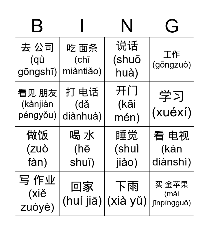 This bingo card has 20 words: 看 电视 (kàn diànshì), 听 老师 (tīng lǎoshī), 说话 (shuō huà), 读 报纸 (dú bàozhǐ), 写 作业 (xiě zuòyè), 看见 朋友 (kànjiàn péngyǒu), 回家 (huí jiā), 去 公司 (qù gōngshī), 做饭 (zuò fàn), 吃 面条 (chī miàntiǎo), 喝 水 (hē shuǐ), 睡觉 (shuì jiào), 打 电话 (dǎ diànhuà), 买 金苹果 (mǎi jīnpíngguǒ), 开门 (kāi mén), 坐 飞机 (zuò fēijī), 学习 (xuéxí), 工作 (gōngzuò), 下雨 (xià yǔ) and 来 我家 (lái wǒjiā).