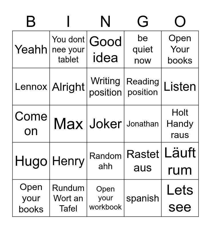 This bingo card has a free space and 24 words: Henry, Rundum Wort an Tafel, Writing position, Open your books, Open Your books, Yeahh, Lennox, You dont nee your tablet, Jonathan, Random ahh, Reading position, Come on, Rastet aus, Läuft rum, Alright, spanish, Holt Handy raus, Good idea, Listen, Max, Lets see, Hugo, be quiet now and Open your workbook.