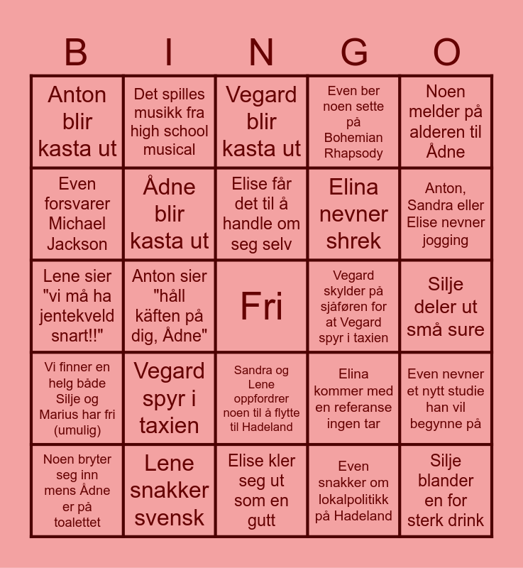 This bingo card has a free space and 29 words: Noen bryter seg inn mens Ådne er på toalettet, Ådne ringer Elise, selv om hun er i samme bygg, Anton sier "håll käften på dig, Ådne", Anton drikker "gammel dansk", Anton blir kasta ut, Vegard blir kasta ut, Ådne blir kasta ut, Vegard spyr i taxien, Vegard skylder på sjåføren for at Vegard spyr i taxien, Lene snakker svensk, Silje deler ut små sure, Silje blander en for sterk drink, Elise kler seg ut som en gutt, Even snakker om lokalpolitikk på Hadeland, Anton, Sandra eller Elise nevner jogging, Sandra ber noen drikke vann, Sandra og Lene oppfordrer noen til å flytte til Hadeland, Vi finner en helg både Silje og Marius har fri (umulig), Noen melder på alderen til Ådne, Lene sier "vi må ha jentekveld snart!!", Elina kommer med en referanse ingen tar, Elina og Elise er interne, Elina nevner shrek, Even forsvarer Michael Jackson, Even ber noen sette på Bohemian Rhapsody, Det spilles musikk fra high school musical, Even nevner et nytt studie han vil begynne på, Elise får det til å handle om seg selv and Noen nevner Leif.