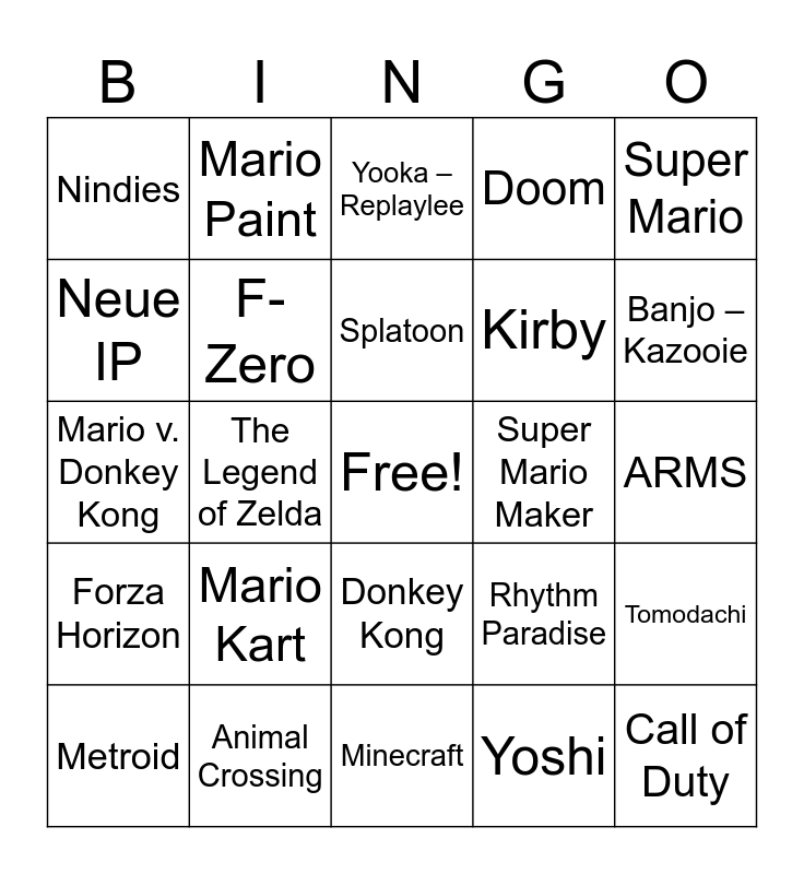 This bingo card has a free space and 24 words: Mario Kart, Animal Crossing, Splatoon, Metroid, Super Mario, Nindies, Neue IP, Mario Paint, Super Mario Maker, Donkey Kong, Kirby, Mario v. Donkey Kong, Rhythm Paradise, Tomodachi, F-Zero, Yoshi, ARMS, Yooka – Replaylee, Banjo – Kazooie, The Legend of Zelda, Call of Duty, Forza Horizon, Doom and Minecraft.