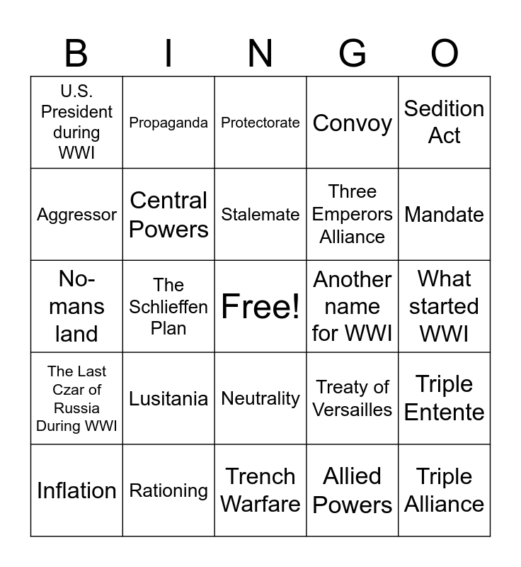 This bingo card has a free space and 24 words: Lusitania, Rationing, Stalemate, Inflation, Sedition Act, U.S. President during WWI, Aggressor, Propaganda, Another name for WWI, Neutrality, Three Emperors Alliance, No-mans land, Treaty of Versailles, Triple Entente, Central Powers, Allied Powers, What started WWI, Protectorate, Mandate, The Schlieffen Plan, Triple Alliance, The Last Czar of Russia During WWI, Convoy and Trench Warfare.
