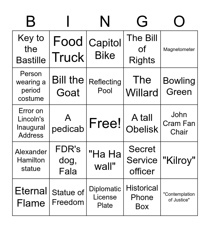 This bingo card has a free space and 24 words: FDR's dog, Fala, Statue of Freedom, Reflecting Pool, Eternal Flame, Magnetometer, Key to the Bastille, Person wearing a period costume, Food Truck, A tall Obelisk, "Ha Ha wall", The Willard, Error on Lincoln's Inaugural Address, Secret Service officer, "Kilroy", Bill the Goat, Historical Phone Box, John Cram Fan Chair, Capitol Bike, Bowling Green, A pedicab, "Contemplation of Justice", Alexander Hamilton statue, The Bill of Rights and Diplomatic License Plate.