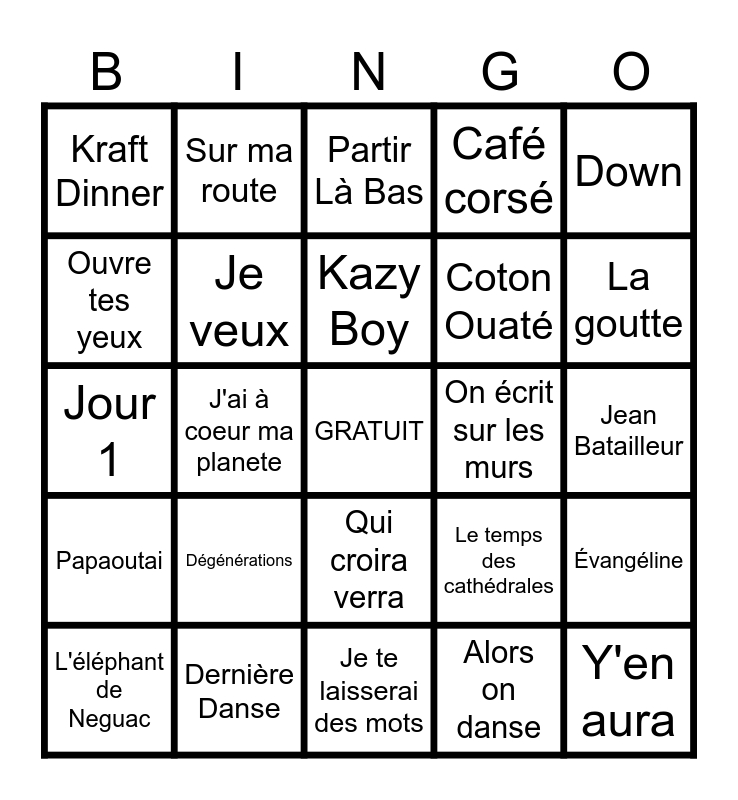 This bingo card has a free space and 59 words: Tourner dans le vide, Dernière Danse, Dommage, Papaoutai, Alors on danse, Si jamais j'oublie, Je veux, Jacuzzi, Coton Ouaté, J'ai mangé trop de patates frites, Café corsé, Grand champion, Ouvre tes yeux, Le Picbois, Pourquoi faire aujourd'hui, Kraft Dinner, Y'en aura, Down, Distance, Kazy Boy, On écrit sur les murs, Partir Là Bas, L'éléphant de Neguac, Évangéline, Petitcodiac, Au bord du lac bijou, Le monde a bien changé, L'écrivain, La goutte, Le pommier doux, La danse du Mardi Gras, Marcher l'plancher, Au chant de l'alouette, Elle me dit, Sur ma route, J'me tire, Bella, J'ai à coeur ma planete, Parce qu'on vient de loin, Jour 1, Le chant des sirènes, Dégénérations, Jean Batailleur, Espionne Russe, Fil de téléphone, J'ai vendu mon char, Gimme Luv, Mamma Mia, Qui croira verra, Je te laisserai des mots, Il est où le bonheur, Color Gitano, Plus tard, La marée, Quand la musique est bonne, Le temps des cathédrales, Comme des enfants en cavale, Pour les hommes and Ne parlons pas de Bruno.