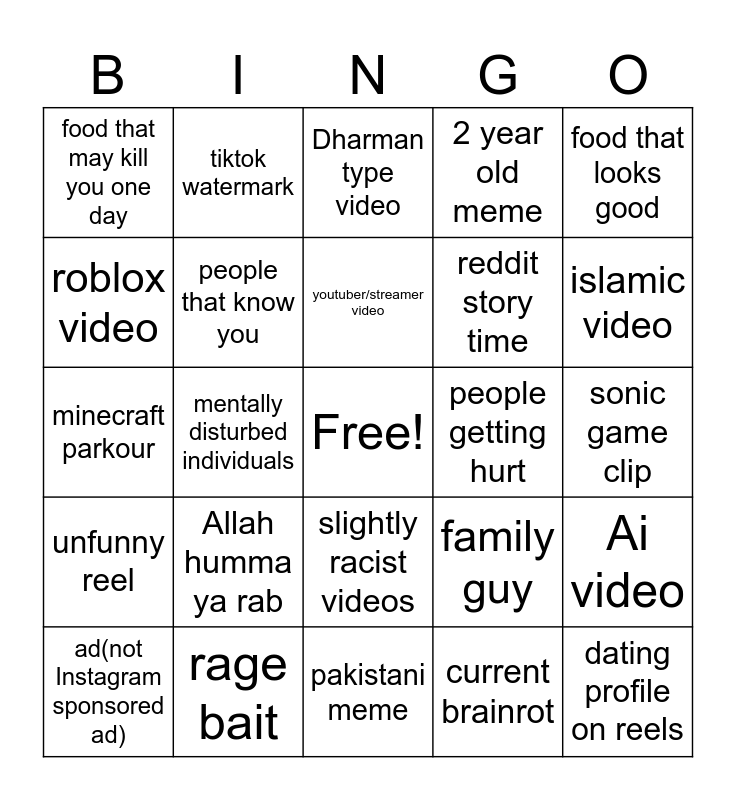 This bingo card has a free space and 25 words: Allah humma ya rab, pakistani meme, youtuber/streamer video, ad(not Instagram sponsored ad), food that looks good, food that may kill you one day, roblox video, tiktok watermark, people getting hurt, slightly racist videos, reddit story time, minecraft parkour, family guy, Ai video, people that know you, tvshow movie recap, sonic game clip, Dharman type video, islamic video, mentally disturbed individuals, dating profile on reels, rage bait, unfunny reel, 2 year old meme and current brainrot.