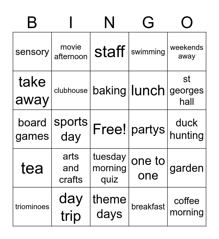 This bingo card has a free space and 24 words: arts and crafts, day trip, baking, triominoes, weekends away, sensory, take away, movie afternoon, partys, tuesday morning quiz, lunch, board games, one to one, garden, clubhouse, breakfast, duck hunting, staff, st georges hall, sports day, coffee morning, tea, swimming and theme days.