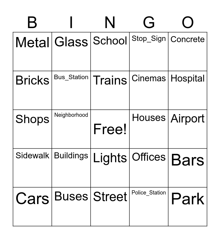This bingo card has a free space and 24 words: Buildings, Buses, Trains, Cars, Concrete, Metal, Bricks, Glass, Houses, Lights, Cinemas, Shops, Offices, Bars, Bus_Station, Police_Station, Airport, School, Hospital, Neighborhood, Park, Sidewalk, Stop_Sign and Street.
