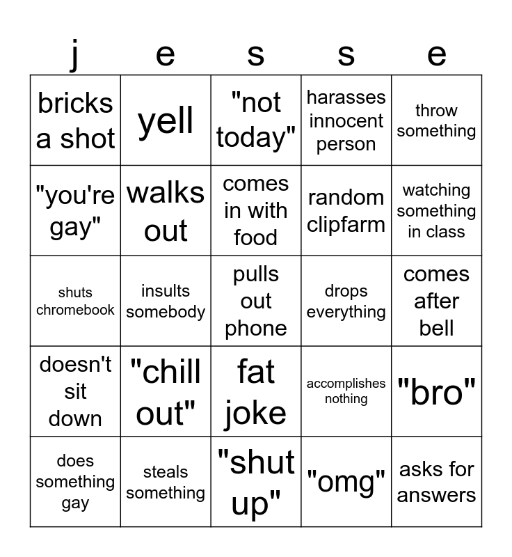 This bingo card has 32 words: "omg", snitches, insults somebody, singing, doesn't sit down, walks out, throw something, "bro", yell, asks for answers, comes in with food, "not today", swings on somebody, blames Carson first, drops everything, threatens someone, does something gay, shuts chromebook, fat joke, "chill out", accomplishes nothing, screams "why", comes after bell, steals something, pulls out phone, harasses innocent person, random clipfarm, "you're gay", bricks a shot, "shut up", glazing and watching something in class.