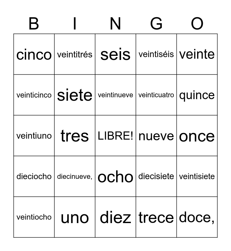 This bingo card has a free space and 30 words: uno, dos, tres, cuatro, cinco, seis, siete, ocho, nueve, diez, once, doce,, trece, catorce, quince, dieciséis, diecisiete, dieciocho, diecinueve,, veinte, veintiuno, veintidós, veintitrés, veinticuatro, veinticinco, veintiséis, veintisiete, veintiocho, veintinueve and treinta.