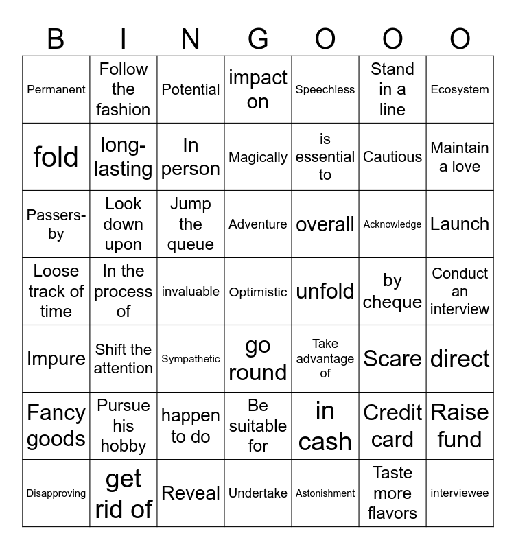 This bingo card has 86 words: Instrument, get rid of, Adventure, interviewee, Go cycling, A trash bag, Credit card, by cheque, in cash, Run out of, Artificial body parts, A replace tail, Acknowledge, Passers- by, Act as, fold, unfold, go round, carry on, direct, happen to do, Scare, Magically, Inaccurate, invaluable, trade, available, Limited, Creativity, Motivation, Loose track of time, A long queue, Fancy goods, Jump the queue, Stand in a line, Conduct an interview, In person, Unpaid, Shift the attention, is essential to, Take advantage of, Be suitable for, Passion, Maintain a love, Raise fund, Speechless, Show off, Follow the fashion, Respond to, Taste more flavors, Pursue his hobby, Astonishment, Look down upon, Promotion, Awaken, unexpected, Reveal, long- lasting, impact on, Ecosystem, Permanent, Inefficient, Indifferent, Sympathetic, Wireless devices, Potential, Symbolic, Cautious, Optimistic, Disapproving, Expand, coverage, Launch, re -launch, Undertake, Remote desert, In the process of, Impure, Pure, gesture, quantity, qualification, Suspect, ideal, overall and Head to.