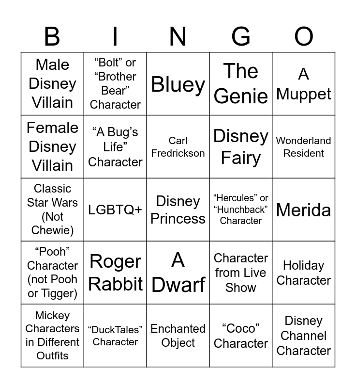 This bingo card has a free space and 24 words: Roger Rabbit, “DuckTales” Character, Carl Fredrickson, Mickey Characters in Different Outfits, A Muppet, Male Disney Villain, Female Disney Villain, “Bolt” or “Brother Bear” Character, “Hercules” or “Hunchback” Character, A Dwarf, Disney Fairy, Classic Star Wars (Not Chewie), Character from Live Show, Holiday Character, “A Bug’s Life” Character, “Coco” Character, Merida, Bluey, Wonderland Resident, LGBTQ+, Disney Channel Character, “Pooh” Character (not Pooh or Tigger), The Genie and Enchanted Object.