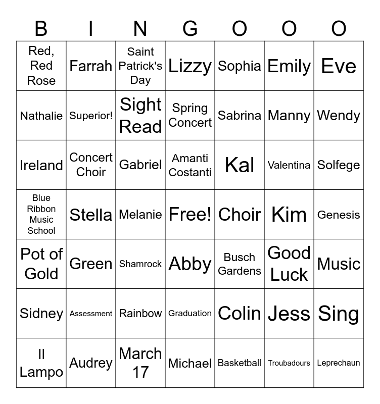 This bingo card has a free space and 48 words: Colin, Manny, Michael, Stella, Gabriel, Genesis, Farrah, Audrey, Emily, Abby, Eve, Lizzy, Valentina, Kal, Sidney, Kim, Nathalie, Wendy, Jess, Sophia, Sabrina, Melanie, Red, Red Rose, Superior!, Sing, Sight Read, Solfege, Il Lampo, Amanti Costanti, Concert Choir, Troubadours, Choir, Music, Assessment, Blue Ribbon Music School, Busch Gardens, Good Luck, Ireland, Shamrock, Rainbow, Pot of Gold, Leprechaun, Saint Patrick's Day, March 17, Spring Concert, Graduation, Green and Basketball.