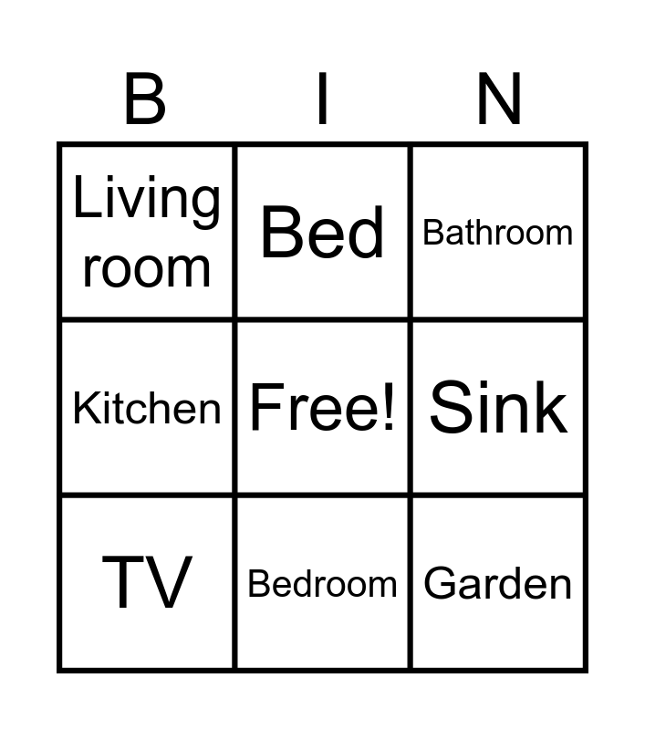 This bingo card has a free space and 10 words: Bedroom, Bathroom, Living room, Garden, Kitchen, TV, Bed, Bath, Sink and Fridge.