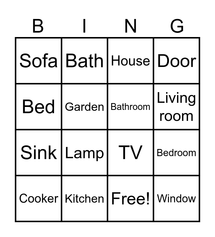 This bingo card has 17 words: Free!, Cooker, House, Sofa, Lamp, Door, Bedroom, Bathroom, Living room, Garden, Kitchen, TV, Bed, Bath, Sink, Fridge and Window.