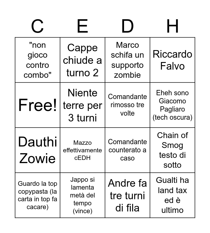 This bingo card has 16 words: Jappo si lamenta metà del tempo (vince), Chain of Smog testo di sotto, Marco schifa un supporto zombie, "non gioco contro combo", Dauthi Zowie, Cappe chiude a turno 2, Comandante counterato a caso, Andre fa tre turni di fila, Free!, Niente terre per 3 turni, Guardo la top copypasta (la carta in top fa cacare), Riccardo Falvo, Mazzo effettivamente cEDH, Eheh sono Giacomo Pagliaro (tech oscura), Comandante rimosso tre volte and Gualti ha land tax ed è ultimo.