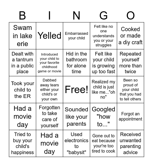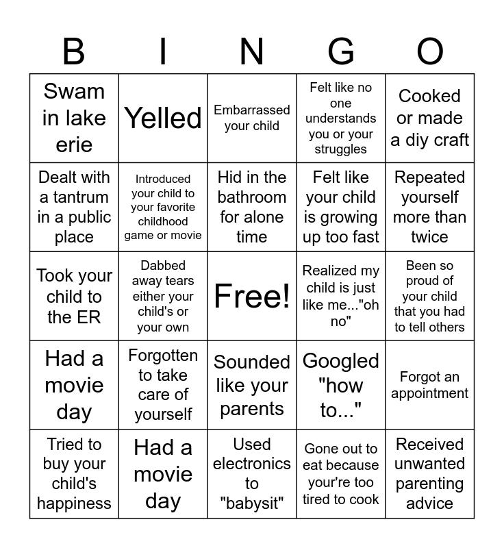 This bingo card has a free space and 24 words: Forgotten to take care of yourself, Had a movie day, Hid in the bathroom for alone time, Tried to buy your child's happiness, Cooked or made a diy craft, Swam in lake erie, Dealt with a tantrum in a public place, Yelled, Realized my child is just like me..."oh no", Sounded like your parents, Felt like your child is growing up too fast, Took your child to the ER, Googled "how to...", Forgot an appointment, Introduced your child to your favorite childhood game or movie, Gone out to eat because your're too tired to cook, Been so proud of your child that you had to tell others, Embarrassed your child, Repeated yourself more than twice, Dabbed away tears either your child's or your own, Received unwanted parenting advice, Had a movie day, Felt like no one understands you or your struggles and Used electronics to "babysit".