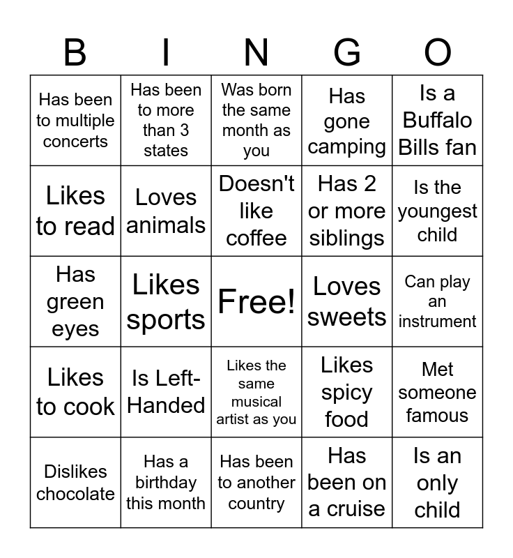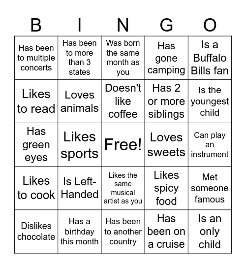 This bingo card has a free space and 24 words: Is Left-Handed, Has a birthday this month, Doesn't like coffee, Dislikes chocolate, Is a Buffalo Bills fan, Has been to multiple concerts, Likes to read, Has been to more than 3 states, Loves sweets, Likes the same musical artist as you, Has 2 or more siblings, Has green eyes, Likes spicy food, Met someone famous, Loves animals, Has been on a cruise, Can play an instrument, Was born the same month as you, Is the youngest child, Likes sports, Is an only child, Likes to cook, Has gone camping and Has been to another country.
