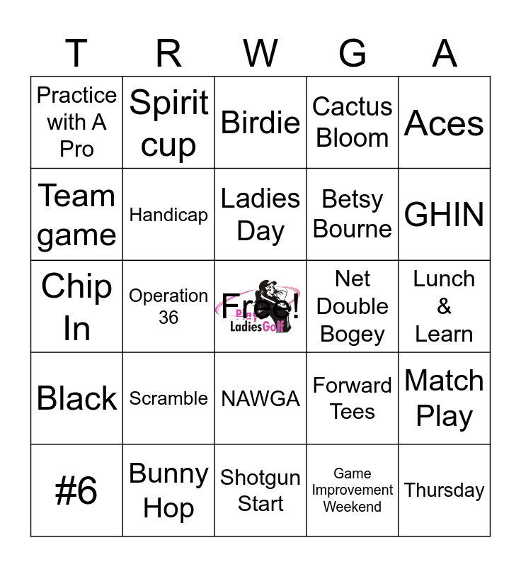 This bingo card has a free space and 48 words: ForeTees, Thursday, Tuesday, Shotgun Start, Scramble, InterClub, Spirit cup, Individual game, Team game, 2 person game, Handicap, Cactus Bloom, Match Play, Forward Tees, Spirit Tees, Pro Shop, Ladies Day, Net Double Bogey, 9:00, Aces, Operation 36, Game Improvement Weekend, Practice with A Pro, Betsy Bourne, Laurie Hubbard, GHIN, #6, Team, NAWGA, Black, Light Blue, 4 hours, Out of Bounds, 2 club lengths, Bunny Hop, 8th of July, Orange & Black, Lunch & Learn, Weekly Clubster post, TRWGA monthly newsletter, Best Ball, Bogey, Birdie, Pace of Play, Chip In, Net Score, Gross Score and Hole In One Club.