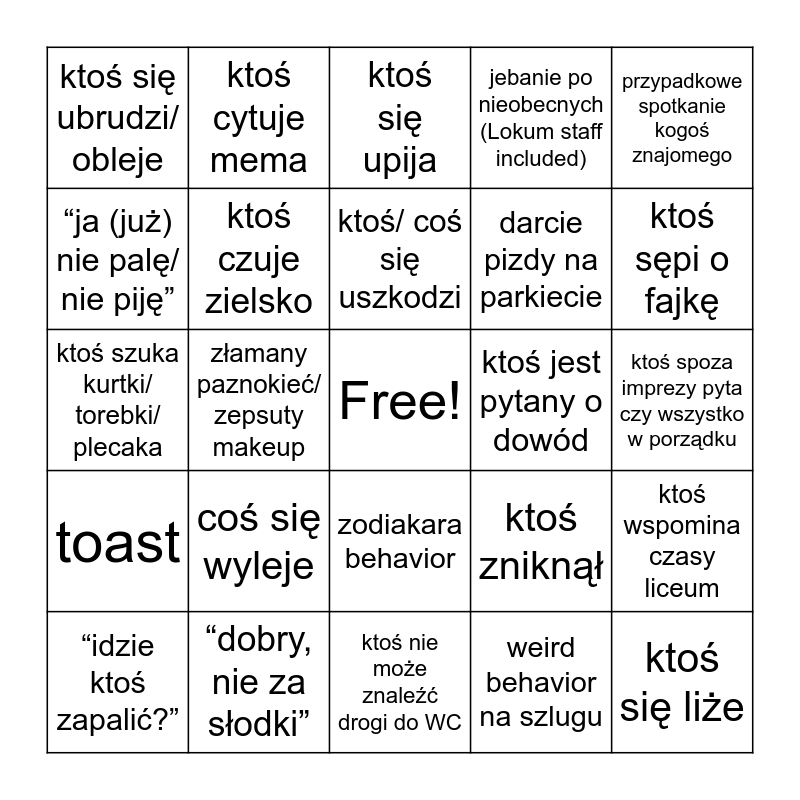 This bingo card has a free space and 24 words: coś się wyleje, “dobry, nie za słodki”, ktoś/ coś się uszkodzi, “idzie ktoś zapalić?”, przypadkowe spotkanie kogoś znajomego, ktoś się ubrudzi/ obleje, “ja (już) nie palę/ nie piję”, ktoś cytuje mema, ktoś jest pytany o dowód, zodiakara behavior, darcie pizdy na parkiecie, ktoś szuka kurtki/ torebki/ plecaka, ktoś zniknął, ktoś wspomina czasy liceum, ktoś czuje zielsko, weird behavior na szlugu, ktoś spoza imprezy pyta czy wszystko w porządku, ktoś się upija, ktoś sępi o fajkę, złamany paznokieć/ zepsuty makeup, ktoś się liże, toast, jebanie po nieobecnych (Lokum staff included) and ktoś nie może znaleźć drogi do WC.