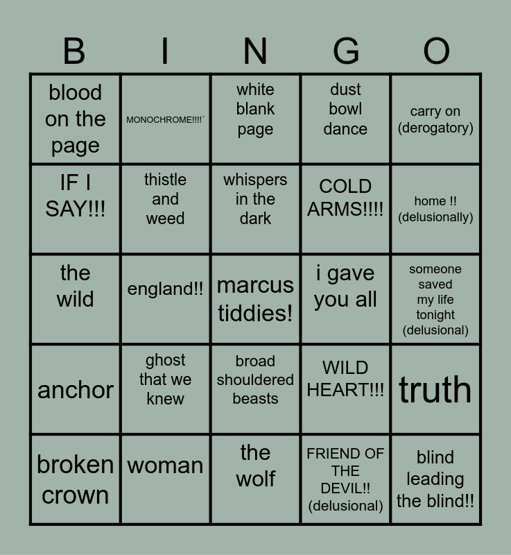 This bingo card has a free space and 24 words: broken crown, ghost that we knew, whispers in the dark, FRIEND OF THE DEVIL!! (delusional), carry on (derogatory), blood on the page, MONOCHROME!!!!´, white blank page, i gave you all, someone saved my life tonight (delusional), the wild, thistle and weed, WILD HEART!!!, truth, IF I SAY!!!, woman, the wolf, dust bowl dance, home !! (delusionally), anchor, england!!, broad shouldered beasts, COLD ARMS!!!! and blind leading the blind!!.