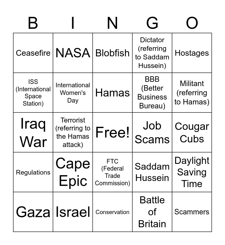This bingo card has a free space and 24 words: Cape Epic, Israel, Hamas, Gaza, Hostages, Ceasefire, ISS (International Space Station), NASA, Job Scams, FTC (Federal Trade Commission), BBB (Better Business Bureau), Iraq War, Saddam Hussein, Daylight Saving Time, International Women's Day, Battle of Britain, Cougar Cubs, Blobfish, Militant (referring to Hamas), Terrorist (referring to the Hamas attack), Scammers, Regulations, Dictator (referring to Saddam Hussein) and Conservation.