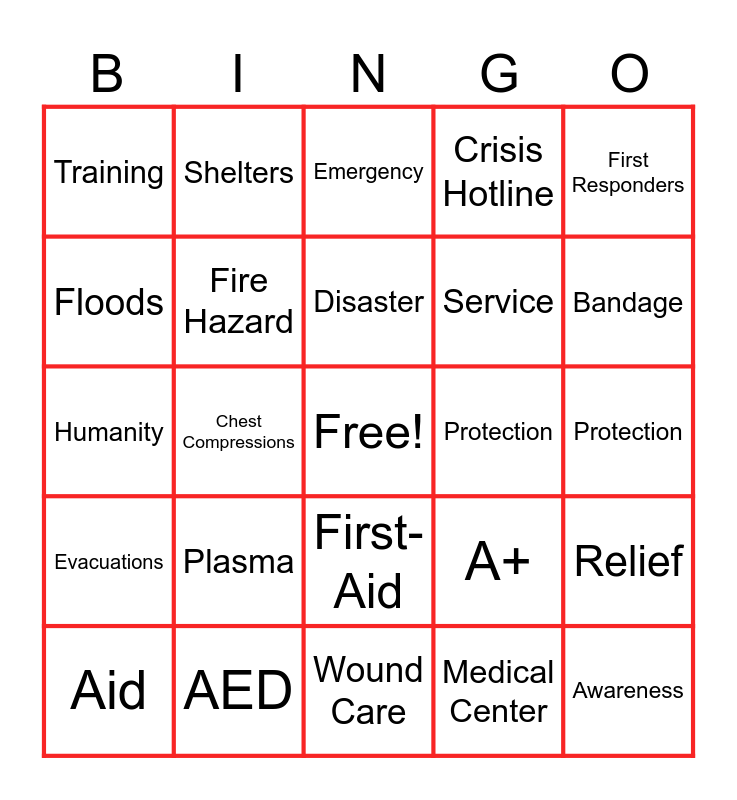 This bingo card has a free space and 34 words: Blood Drive, Medical Center, CPR, Volunteer, Evacuations, Fire Hazard, First Responders, Aid, Shelters, Donor, Disaster, Emergency, Health Services, Safety, Protection, Bandage, AED, Humanity, Plasma, A+, First-Aid, Welfare, Training, Protection, Wound Care, Awareness, Crisis Hotline, Community, Service, Floods, Recovery, Chest Compressions, Relief and Health.