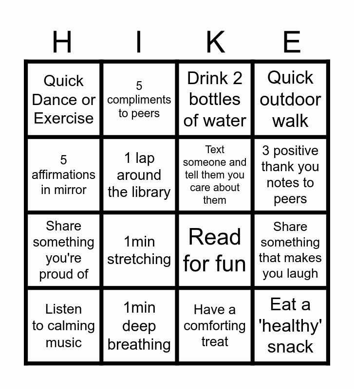 This bingo card has 16 words: 1min deep breathing, Share something that makes you laugh, Drink 2 bottles of water, Quick Dance or Exercise, Share something you're proud of, 5 compliments to peers, Read for fun, Have a comforting treat, 5 affirmations in mirror, 1 lap around the library, Listen to calming music, Quick outdoor walk, 1min stretching, 3 positive thank you notes to peers, Text someone and tell them you care about them and Eat a 'healthy' snack.