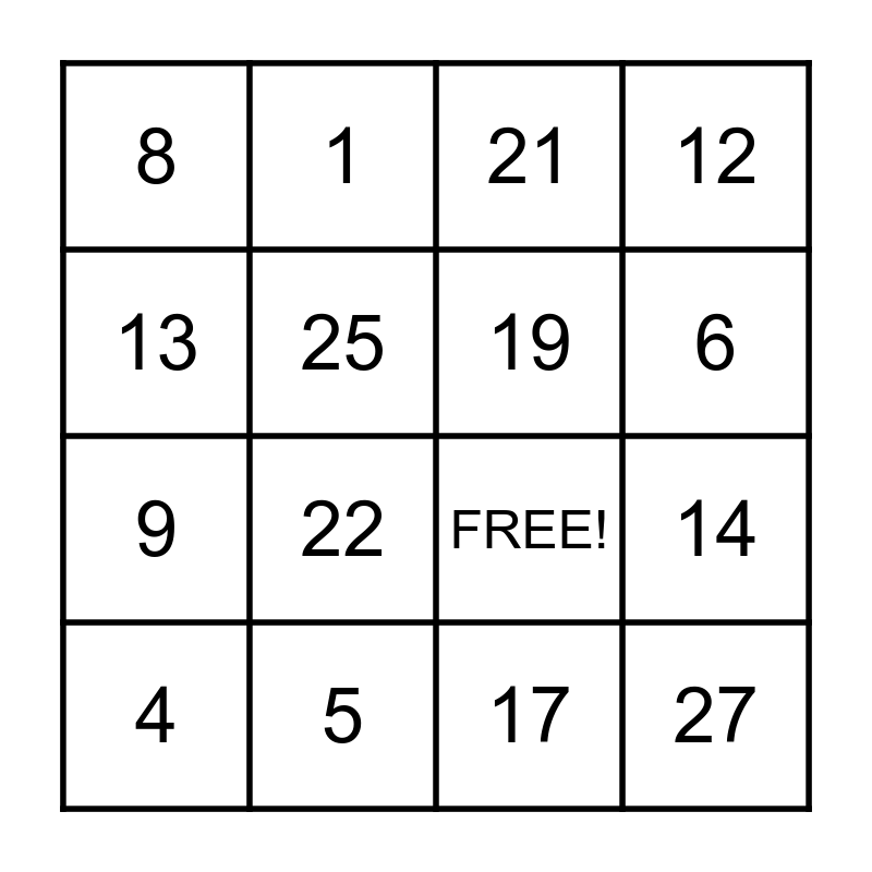 This bingo card has 16 words: 5, 14, 21, 8, 9, 1, FREE!, 17, 13, 25, 4, 12, 22, 6, 19 and 27.