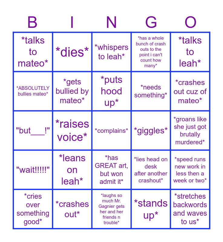 This bingo card has a free space and 24 words: *leans on leah*, *crashes out*, *puts hood up*, *cries over something good*, *talks to leah*, *talks to mateo*, *ABSOLUTELY bullies mateo*, *dies*, *giggles*, *has GREAT art, but won admit it*, *needs something*, "but___!", *lies head on desk after another crashout*, *speed runs new work in less then a week or two*, *gets bullied by mateo*, *stands up*, *groans like she just got brutally murdered*, *whispers to leah*, *crashes out cuz of mateo*, *raises voice*, *stretches backwords and waves to us*, "wait!!!!!", *has a whole bunch of crash outs to the point i can't count how many* and *laughs so much Mr. Gagnier gets her and her friends n trouble*.