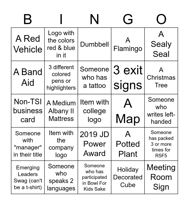 This bingo card has 25 words: Item with the company logo, Someone who has participated in Bowl For Kids Sake, Someone who has a tattoo, Emerging Leaders Swag (can't be a t-shirt), A Sealy Seal, A Red Vehicle, A Band Aid, Logo with the colors red & blue in it, A Map, 2019 JD Power Award, 3 exit signs, Non-TSI business card, A Potted Plant, Someone has packed 3 or more times for R5F5, 3 different colored pens or highlighters, Meeting Room Sign, Someone who writes left-handed, Dumbbell, A Christmas Tree, A Medium Albany II Mattress, Item with college logo, Someone who speaks 2 languages, Someone with "manager" in their title, A Flamingo and Holiday Decorated Cube.