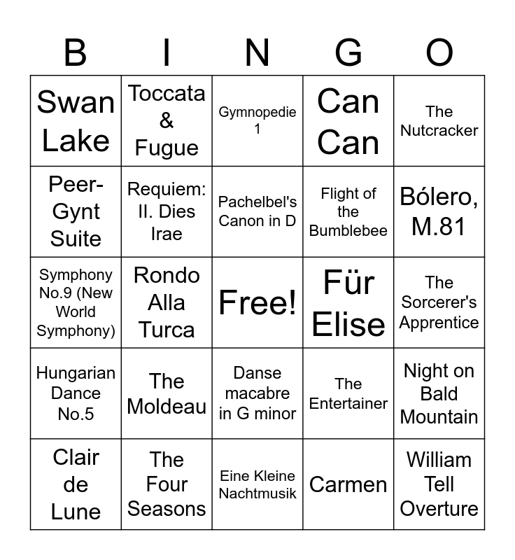 This bingo card has a free space and 24 words: The Moldeau, The Four Seasons, Pachelbel's Canon in D, Clair de Lune, The Nutcracker, Swan Lake, Peer-Gynt Suite, Toccata & Fugue, Für Elise, Danse macabre in G minor, Flight of the Bumblebee, Symphony No.9 (New World Symphony), The Entertainer, Night on Bald Mountain, Requiem: II. Dies Irae, Carmen, The Sorcerer's Apprentice, Gymnopedie 1, Bólero, M.81, Rondo Alla Turca, William Tell Overture, Hungarian Dance No.5, Can Can and Eine Kleine Nachtmusik.