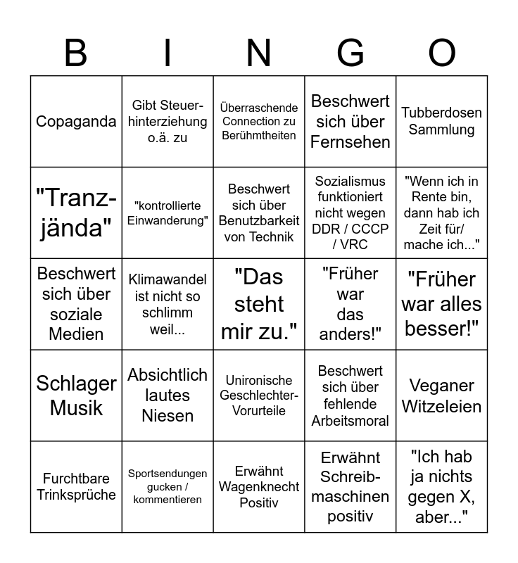This bingo card has a free space and 24 words: Absichtlich lautes Niesen, Sportsendungen gucken / kommentieren, Beschwert sich über Benutzbarkeit von Technik, Furchtbare Trinksprüche, Tubberdosen Sammlung, Copaganda, "Tranz-jända", Gibt Steuer-hinterziehung o.ä. zu, "Früher war das anders!", Unironische Geschlechter- Vorurteile, Sozialismus funktioniert nicht wegen DDR / CCCP / VRC, Beschwert sich über soziale Medien, Beschwert sich über fehlende Arbeitsmoral, Veganer Witzeleien, "kontrollierte Einwanderung", Erwähnt Schreib-maschinen positiv, "Früher war alles besser!", Überraschende Connection zu Berühmtheiten, "Wenn ich in Rente bin, dann hab ich Zeit für/ mache ich...", Klimawandel ist nicht so schlimm weil..., "Ich hab ja nichts gegen X, aber...", Schlager Musik, Beschwert sich über Fernsehen and Erwähnt Wagenknecht Positiv.