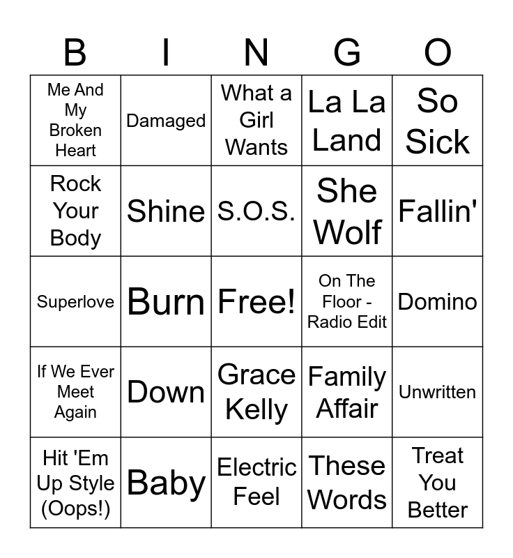 This bingo card has a free space and 40 words: In the End, Superlove, Breathless, Shine, Baby, Grace Kelly, S.O.S., Push The Button, So Sick, If We Ever Meet Again, Burn, La La Land, Treat You Better, Domino, On The Floor - Radio Edit, Down, Wish You Well, Me And My Broken Heart, 19 Somethin' - Greatest Hits Version, What a Girl Wants, Unwritten, These Words, She Wolf, Rock Your Body, One Step At a Time, New Soul, Miss Independent, Me & U, Love Song, Listen to Your Heart - Hardbounce Single Edit, I Gotta Feeling, Hit 'Em Up Style (Oops!), Get the Party Started, Family Affair, Fallin', Electric Feel, Don't Stop The Music, Days Go By - Radio Edit, Damaged and Crazy In Love (feat. JAY-Z).