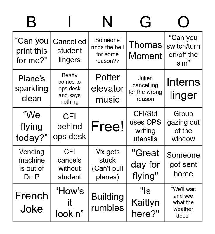 This bingo card has a free space and 24 words: CFI cancels without student, “How’s it lookin”, Potter elevator music, French Joke, “Can you switch/turn on/off the sim”, “Can you print this for me?”, Plane’s sparkling clean, Cancelled student lingers, CFI/Std uses OPS writing utensils, Mx gets stuck (Can't pull planes), Julien cancelling for the wrong reason, “We flying today?”, "Great day for flying", Someone got sent home, Beatty comes to ops desk and says nothing, "Is Kaitlyn here?", Group gazing out of the window, Someone rings the bell for some reason??, Interns linger, CFI behind ops desk, "We'll wait and see what the weather does", Vending machine is out of Dr. P, Thomas Moment and Building rumbles.