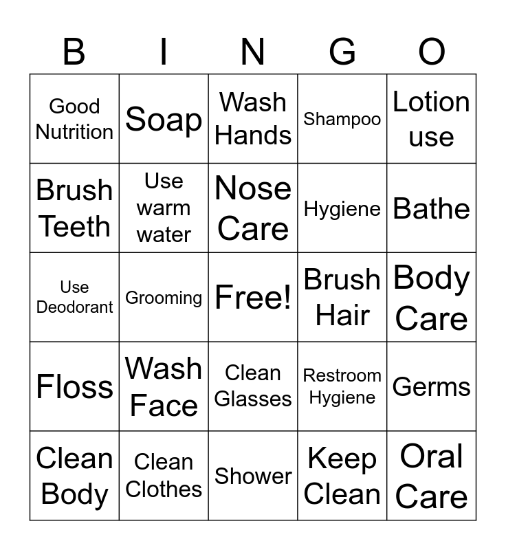 This bingo card has a free space and 28 words: Germs, Healthy, Hygiene, Keep Clean, Brush Teeth, Wash Hands, Soap, Floss, Brush Hair, Clean Body, Use Deodorant, Shampoo, Clean Clothes, Shower, Bathe, Clean fingernails, Wash Face, Use warm water, Nose Care, Clean Glasses, Good Nutrition, Dress for weather, Oral Care, Grooming, Body Care, Restroom Hygiene, Lotion use and Hygiene Manners.