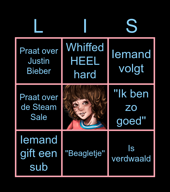 This bingo card has a free space and 15 words: ''hallo??!!'', Bot bericht in chat, Iemand volgt, Praat over Justin Bieber, ''Beagletje'', Is verdwaald, Contol woord grap, Gaat dood en geeft de game de schuld, ''Ik ben zo goed'', Iemand subbed, Drukt per ongeluk op de verkeerde knop, Praat over de Steam Sale, Iemand gift een sub, Whiffed HEEL hard and ''Ik ben zo slecht''.