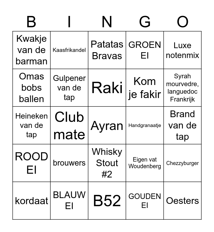 This bingo card has 25 words: brouwers, B52, Raki, kordaat, Luxe notenmix, Kwakje van de barman, Omas bobs ballen, Kaasfrikandel, Handgranaatje, Whisky Stout #2, Kom je fakir, Heineken van de tap, Eigen vat Woudenberg, Chezzyburger, Gulpener van de tap, Oesters, Brand van de tap, Patatas Bravas, Syrah mourvedre, languedoc Frankrijk, Club mate, Ayran, BLAUW EI, ROOD EI, GROEN EI and GOUDEN EI.