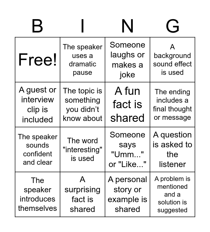 This bingo card has 16 words: The speaker introduces themselves, A surprising fact is shared, Someone laughs or makes a joke, A background sound effect is used, A guest or interview clip is included, The speaker uses a dramatic pause, Someone says "Umm..." or "Like...", A question is asked to the listener, Free!, The topic is something you didn’t know about, A personal story or example is shared, The ending includes a final thought or message, The speaker sounds confident and clear, The word "interesting" is used, A fun fact is shared and A problem is mentioned and a solution is suggested.