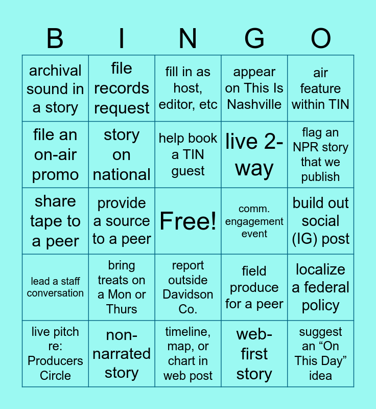 This bingo card has a free space and 28 words: localize a federal policy, file a standup, live 2-way, web-first story, file an on-air promo, fill in as host, editor, etc, file records request, lead a staff conversation, comm. engagement event, live pitch re: Producers Circle, share tape to a peer, appear on This Is Nashville, non-narrated story, timeline, map, or chart in web post, flag an NPR story that we publish, record 3 intros, bring treats on a Mon or Thurs, story on national, help book a TIN guest, report outside Davidson Co., archival sound in a story, write a NashVillager, suggest an “On This Day” idea, provide a source to a peer, build out social (IG) post, field produce for a peer, air feature within TIN and guest host TIN.
