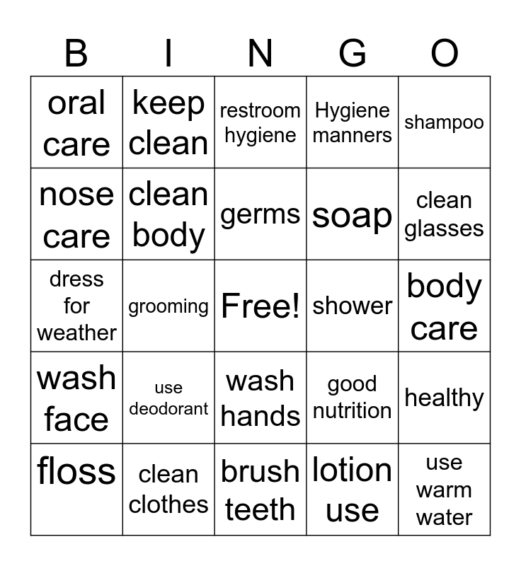 This bingo card has a free space and 29 words: floss, clean fingernails, grooming, bathe, oral care, restroom hygiene, clean body, use deodorant, shower, clean clothes, body care, use warm water, brush teeth, lotion use, clean glasses, hygiene, wash hands, wash face, shampoo, dress for weather, good nutrition, brush hair, soap, nose care, Hygiene manners, keep clean, healthy, germs and smelly.