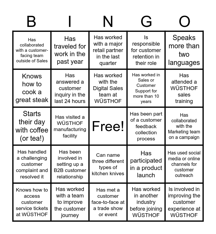 This bingo card has a free space and 36 words: Has worked in Sales at WÜSTHOF for over 5 years, Has used a WÜSTHOF knife at home, Knows the WÜSTHOF product line inside and out, Has answered a customer inquiry in the last 24 hours, Has participated in a product launch, Has handled a challenging customer complaint and resolved it, Has worked with the Digital Sales team at WÜSTHOF, Has provided feedback to improve customer service processes, Speaks more than two languages, Has given a customer product demonstration in the past month, Has visited a WÜSTHOF manufacturing facility, Is responsible for customer retention in their role, Has worked with clients from more than three different countries, Has been part of a customer feedback collection process, Has attended a WÜSTHOF sales training, Has collaborated with a customer-facing team outside of Sales, Has received positive feedback from a customer in the last month, Has been involved in setting up a B2B customer relationship, Is involved in improving the customer experience at WÜSTHOF, Has worked with a major retail partner in the last quarter, Has collaborated with the Marketing team on a campaign, Has used social media or online channels for customer outreach, Has worked with a team to improve the customer journey, Knows how to access customer service tickets at WÜSTHOF, Has met a customer face-to-face at a trade show or event, Has traveled for work in the past year, Starts their day with coffee (or tea!), Prefers in-person meetings over virtual ones, Has worked in Sales or Customer Support for more than 10 years, Knows how to cook a great steak, Has met a celebrity chef before, Loves visiting trade shows and industry events, Has worked in another industry before joining WÜSTHOF, Can name three different types of kitchen knives, Enjoys trying out new restaurants for "research" and Has used customer insights to adjust a sales strategy.
