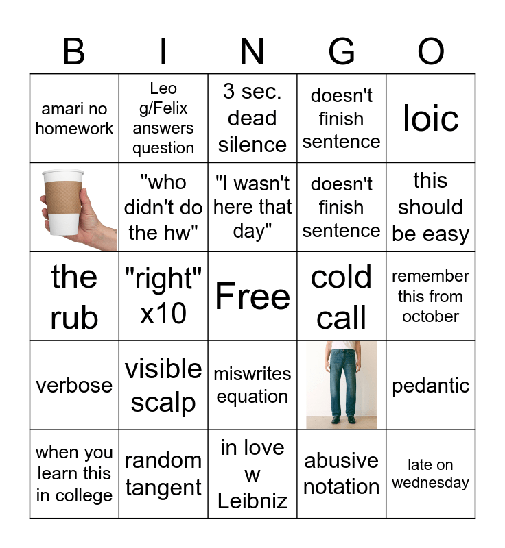 This bingo card has 3 images, a free space and 26 words: when you learn this in college, "right" x10, asha coffee, amari no homework, 3 sec. dead silence, "who didn't do the hw", visible scalp, cold call, random tangent, remember this from october, late on wednesday, in love w Leibniz, abusive notation, this should be easy, access a ride, miswrites equation, verbose, loic, the rub, brings coffee, doesn't finish sentence, doesn't finish sentence, Leo g/Felix answers question, pedantic, "I wasn't here that day" and Leo s argument.