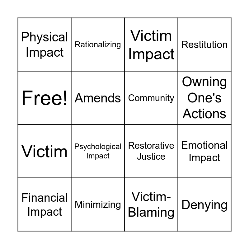 This bingo card has 16 words: Minimizing, Emotional Impact, Victim Impact, Physical Impact, Victim, Rationalizing, Restorative Justice, Victim-Blaming, Free!, Amends, Financial Impact, Restitution, Psychological Impact, Owning One's Actions, Community and Denying.