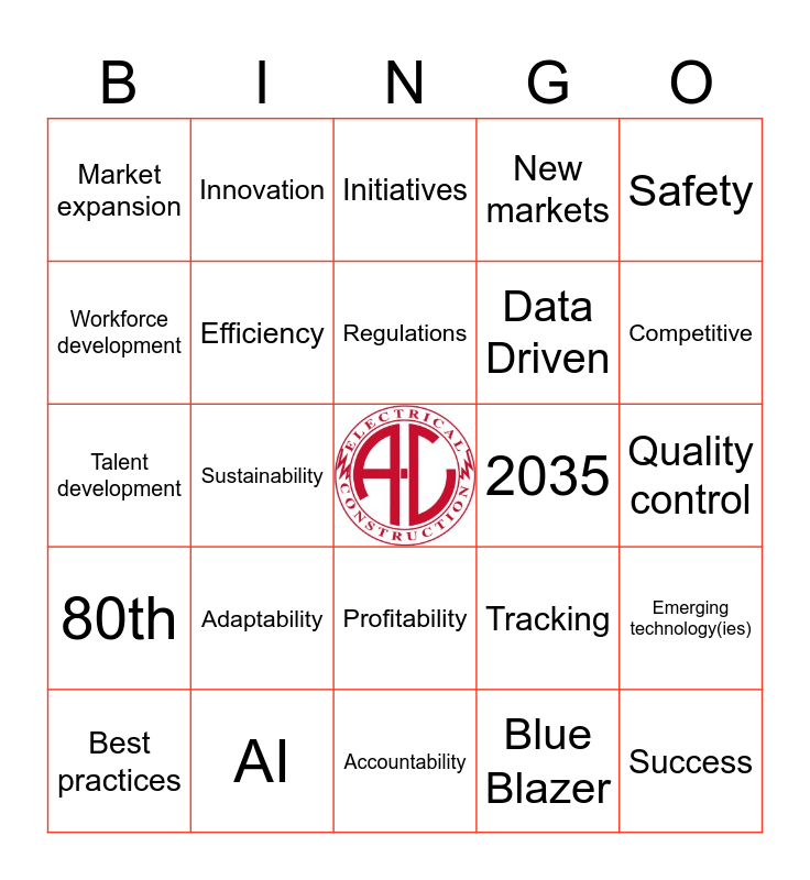 This bingo card has 1 images, a free space and 32 words: Electrification, Sustainability, Renewable(s), 80th, Efficiency, Safety, Best practices, Innovation, Customer satisfaction, Regulations, Initiatives, 2030, Scalable, 2035, Competitive, AI, Talent development, Adaptability, Tracking, Profitability, Collaboration, Market expansion, Quality control, Accountability, Success, New markets, Data Driven, Workforce development, Emerging technology(ies), Kaiser, Blue Blazer and Alexander.