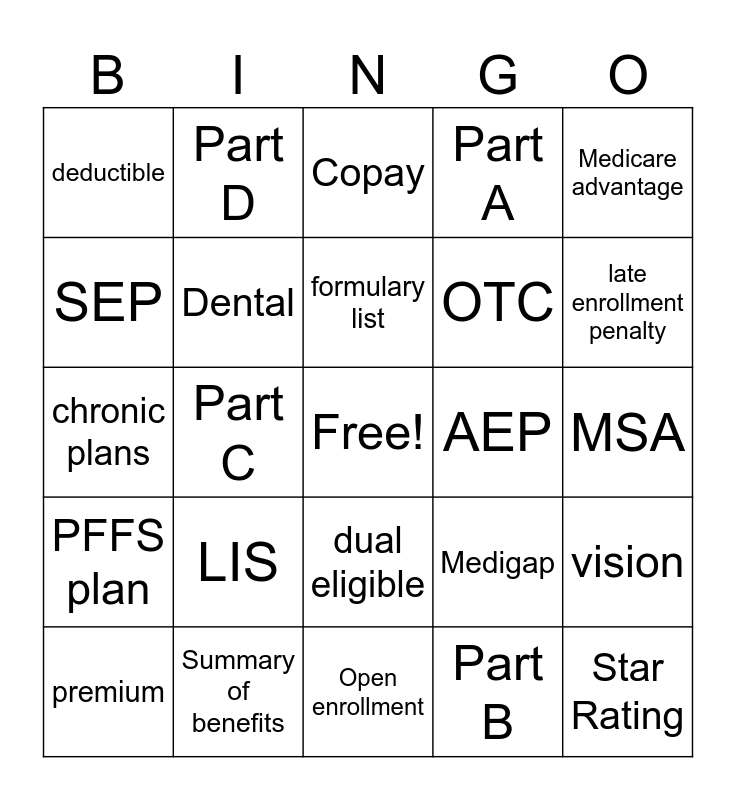 This bingo card has a free space and 24 words: LIS, Summary of benefits, formulary list, premium, Medicare advantage, deductible, SEP, Part D, AEP, dual eligible, OTC, chronic plans, Medigap, vision, Dental, Part B, MSA, Copay, late enrollment penalty, Part C, Star Rating, PFFS plan, Part A and Open enrollment.