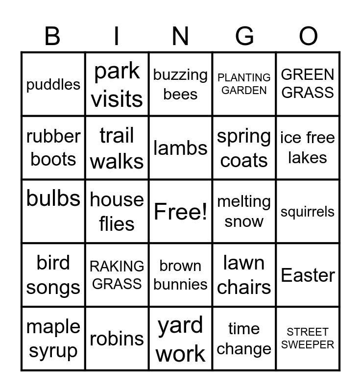 This bingo card has a free space and 40 words: tulips, bulbs, daffodils, trail walks, robins, brown bunnies, lambs, tree buds, GREEN GRASS, bird songs, house flies, PLANTING GARDEN, STREET SWEEPER, squirrels, melting snow, RAKING GRASS, spring showers, puddles, baby chicks, buzzing bees, Easter, time change, spring coats, rubber boots, snow shovels away, umbrellas, green sprouts, warm afternoons, mole tunnel, mud, frosty nights, maple syrup, afternoon walks, lawn chairs, ice free lakes, yard work, porch sitting, picnics, park visits and goo.