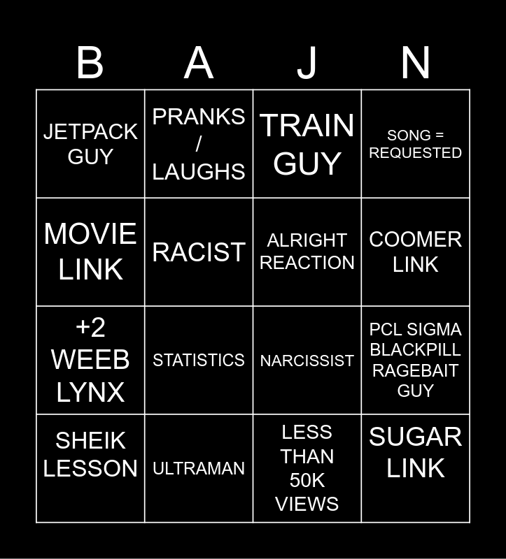 This bingo card has 16 words: ULTRAMAN, PCL SIGMA BLACKPILL RAGEBAIT GUY, TRAIN GUY, JETPACK GUY, +2 WEEB LYNX, PRANKS / LAUGHS, NARCISSIST, LESS THAN 50K VIEWS, MOVIE LINK, RACIST, SHEIK LESSON, SONG = REQUESTED, STATISTICS, COOMER LINK, ALRIGHT REACTION and SUGAR LINK.