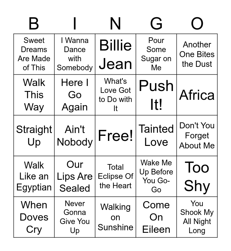 This bingo card has a free space and 48 words: Just Like Heaven, You Shook My All Night Long, All Night Long, Walking on Sunshine, Our Lips Are Sealed, Don't You Want Me, I Wanna Dance with Somebody, With Or Without You, Walk This Way, Down Under, Here I Go Again, Pour Some Sugar on Me, Too Shy, Wake Me Up Before You Go-Go, Every Breath You Take, Blister in the Sun, What's Love Got to Do with It, Tainted Love, Fight For Your Right, Another One Bites the Dust, Ain't Nobody, Come On Eileen, Sweet Dreams Are Made of This, Push It!, Take On Me, Africa, When Doves Cry, I Ran, Total Eclipse Of the Heart, Walk Like an Egyptian, Need You Tonight, Sweet Child O' Mine, Call Me, Keep On Loving You, Never Gonna Give You Up, Love Will Tear Us Apart, I Want to Know What Love Is, Don't You Forget About Me, Fight The Power, I've Had The Time of My Life, I Love Rock 'n' Roll, Hungry Like the Wolf, Billie Jean, Beat It, Straight Up, Jump, Girls Just Want To Have Fun and Burning Down the House.