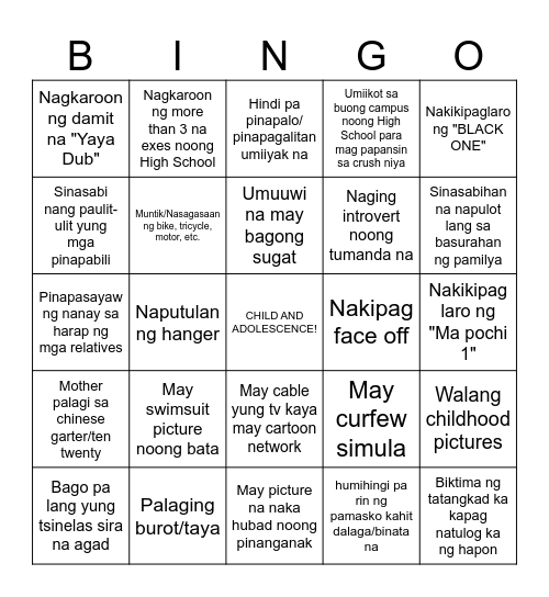 This bingo card has a free space and 24 words: May swimsuit picture noong bata, Palaging burot/taya, Umuuwi na may bagong sugat, Bago pa lang yung tsinelas sira na agad, Nakikipaglaro ng "BLACK ONE", Nagkaroon ng damit na "Yaya Dub", Sinasabi nang paulit-ulit yung mga pinapabili, Nagkaroon ng more than 3 na exes noong High School, Nakipag face off, May cable yung tv kaya may cartoon network, Naging introvert noong tumanda na, Pinapasayaw ng nanay sa harap ng mga relatives, May curfew simula, Walang childhood pictures, Muntik/Nasagasaan ng bike, tricycle, motor, etc., humihingi pa rin ng pamasko kahit dalaga/binata na, Nakikipag laro ng "Ma pochi 1", Hindi pa pinapalo/ pinapagalitan umiiyak na, Sinasabihan na napulot lang sa basurahan ng pamilya, Naputulan ng hanger, Biktima ng tatangkad ka kapag natulog ka ng hapon, Mother palagi sa chinese garter/ten twenty, Umiikot sa buong campus noong High School para mag papansin sa crush niya and May picture na naka hubad noong pinanganak.